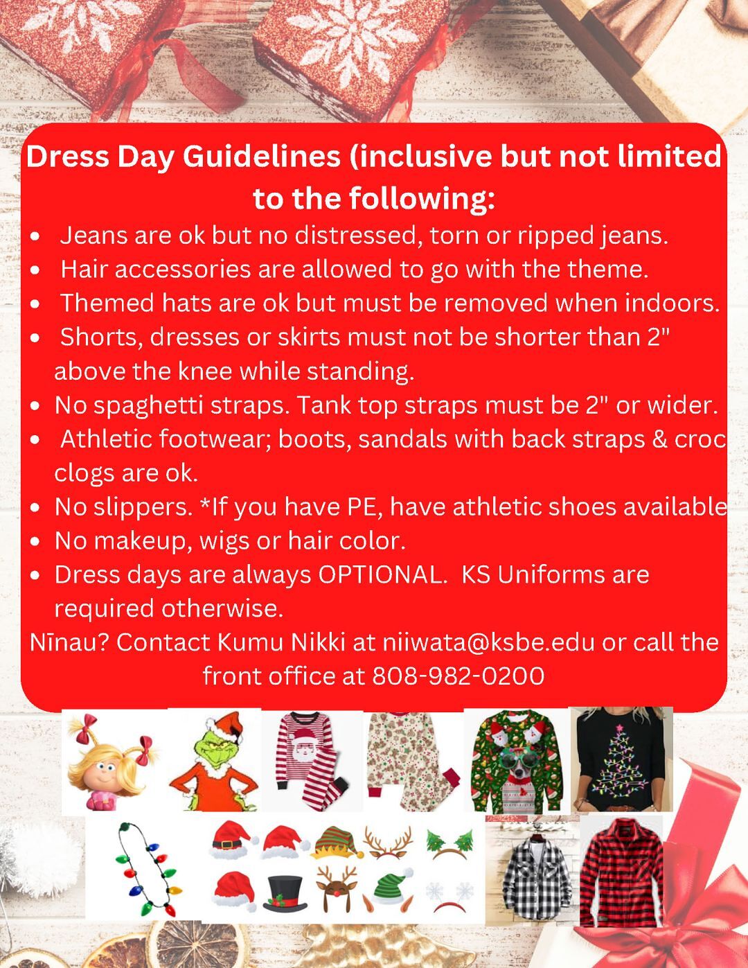 Please pay attention to the dress guidelines for the week (seen below). Jeans are acceptable every day as long as it is paired with the themed wear for the day. Footwear throughout the week can be crocs sliders WITH Christmas themed attire. NO slippers.