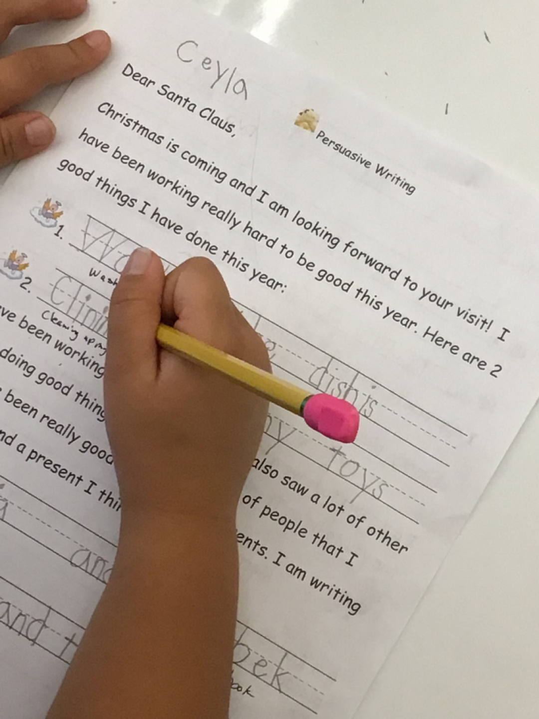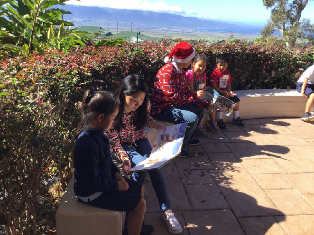We have also been reading stories to use our comprehension strategies to make connections, inferences, and determining importance. To practice our comprehension strategies, High School Kaliko Class (Enrichment Class) Hogwart’s Maui students led by Kalena Laepa`a, Kaui Podlewski, Chauna Rickard, and Lori Guntzl came to read Christmas stories. We have also been working on persuasive writing to justify to Santa how well we have been behaving. Building on Mr. Kimoto’s lessons on giving, we wrote letters to Santa asking him to give presents to others.