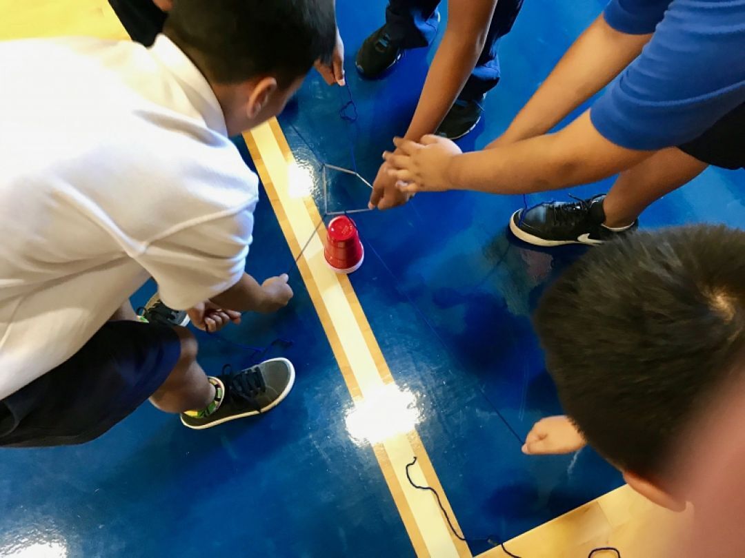 Station 3 - Each team member grabbed a string attached to a single rubber band. Everyone on the team has to pull the string to open the rubber band to grasp a cup, transport that cup across the gym, then stack it to build a pyramid.