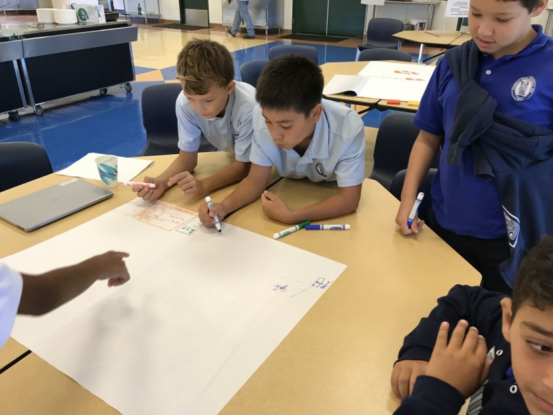 Once students brainstormed ideas, they put together presentations for their ideas, which ultimately led to a theoretical prototype or a solution. Students were then assigned to different classrooms where they presented their problems and solutions to KS teachers for consideration. There were ideas ranging from classrooms in virtual reality, innovative transportation systems to schools, and more. Overall, students experienced teambuilding with others who might not be in their normal social circle, learned about future technologies, and also experienced design thinking in action to help build a better future for themselves.
