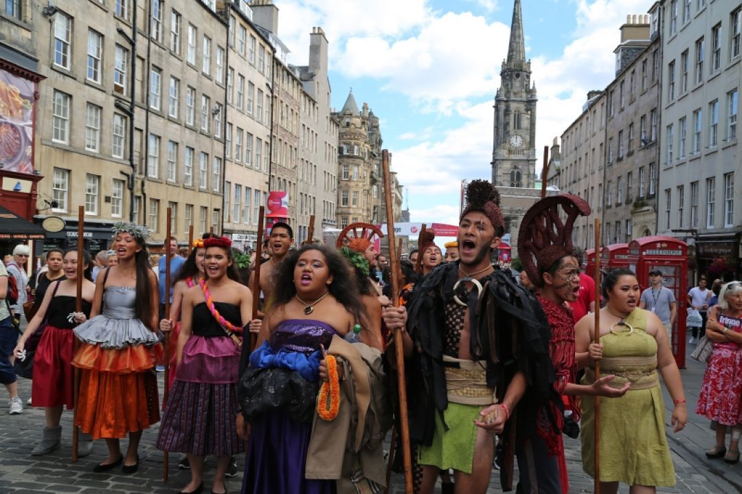 Kalaʻi (center) leads the Hāʻupu cast up the Royal Mile in Edinburgh, Scotland to promote their Hawaiian opera and encourage festival goers to attend.
