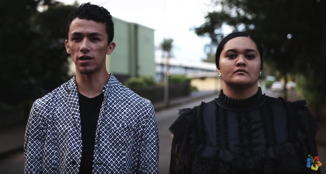 Daylan-Blake Kalaʻi with Mamo Esera, who portrays Queen Liliʻuokalani in the music video "No Liliʻuokalani".