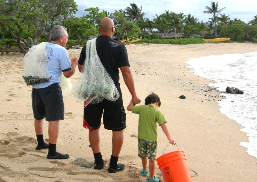 Growing up in Kona my father would take me to go holoholo. He would carry his ʻupena (throw net) and I carried the bucket and we would walk along the shoreline from Kikaua Point north to Kaupūlehu or on some days we would go south to Maniniʻowale.