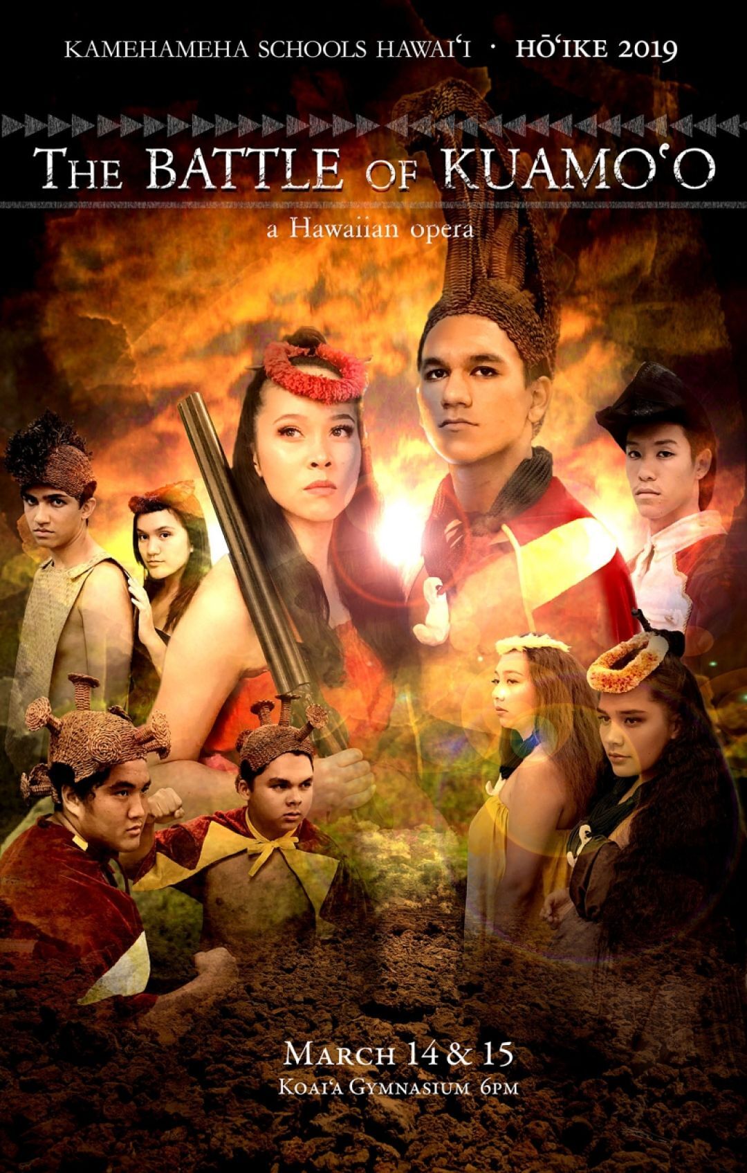 Hō‘ike 2014 dramatizes the moments that lead to the final battle for the Kingdom of Hawai‘i. The story begins months after Kamehameha the Greats death and follows the power struggle between Kamehameha II, Liholiho, and the keeper of the war god, Kekuaokalani. After Liholiho—on the advice of Ka‘ahumanu— decides not to reinstate the ‘ai kapu, which in essence strikes down the ancient religious system, Kekuaokalani, the defender of the the ancient gods, rises up in rebellion against Liholiho. The result is the battle of Kuamo‘o, the war between the traditional and the modern. At the center of this is Manono, Kekuaokalaniās wife, whose dedication and love drives her husband forward in his defense of the ancient religion. In the end both die performing the greatest sacrifice a human can for his or her culture. Battle of Kuamo‘o will be reprised for Kamehameha Schools Hawai‘i Hō‘ike 2019 on March 14 and 15, and then travel to Scotland in August for several performances at the Edinburgh Festival Fringe, the world‘s largest performing arts festival.
