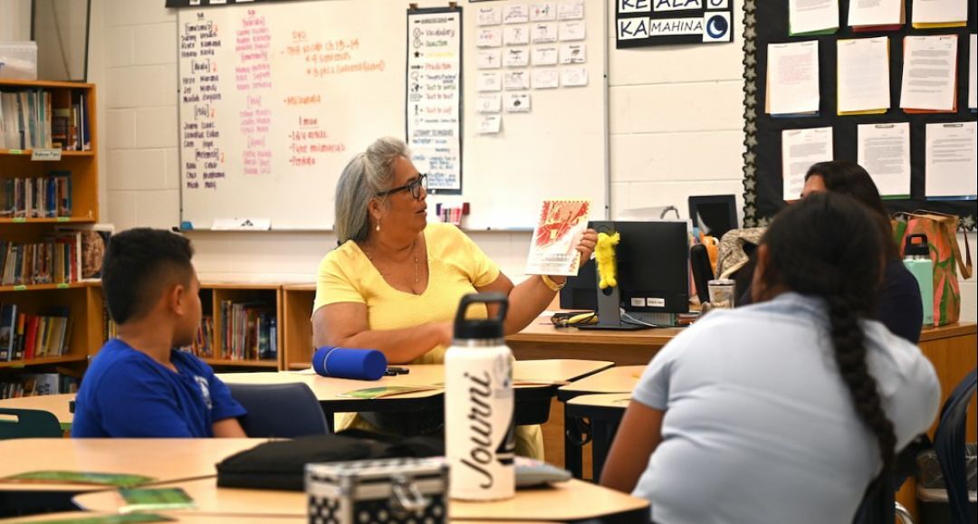 “Your kumu invited me to come read to you today. And I brought along my friend,” Kaniaupio-Crozier said, gesturing to Kumu Kanoelehua Kamaliʻi-Ligsay, also an HCBE coordinator, sitting beside her.