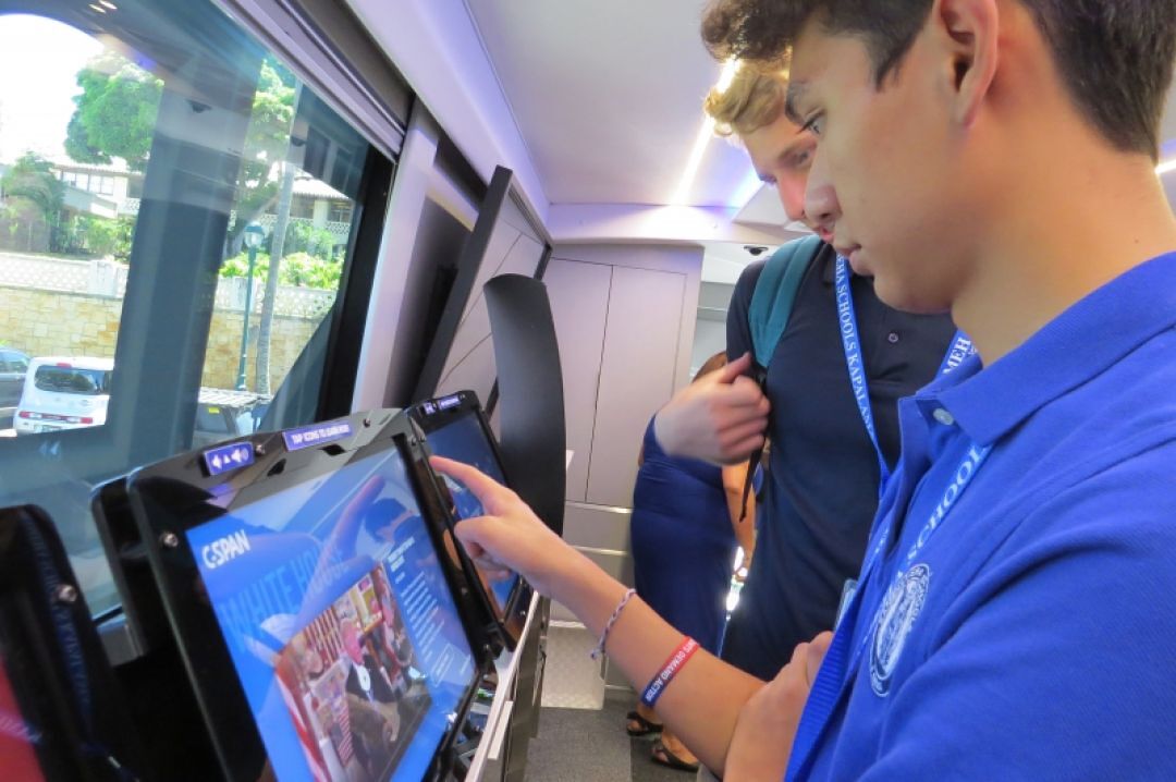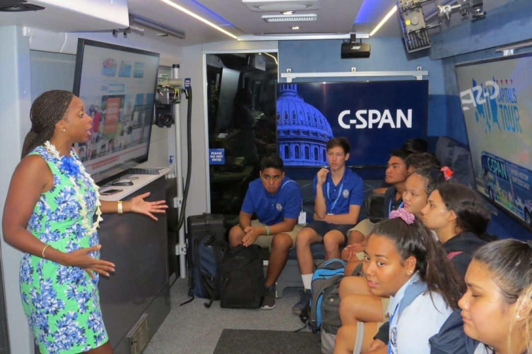 KS Kapālama haumāna got an inside look at D.C. politics last week. C-SPAN – the Washington, D.C.-based public affairs network – brought its interactive multimedia bus to campus last Friday as part of its Bus 50 Capitals Tour. Students learned about C-SPAN’s high-tech educational resources aimed at increasing civic and community engagement among learners. Teachers were treated to free customizable C-SPAN classroom tools.
