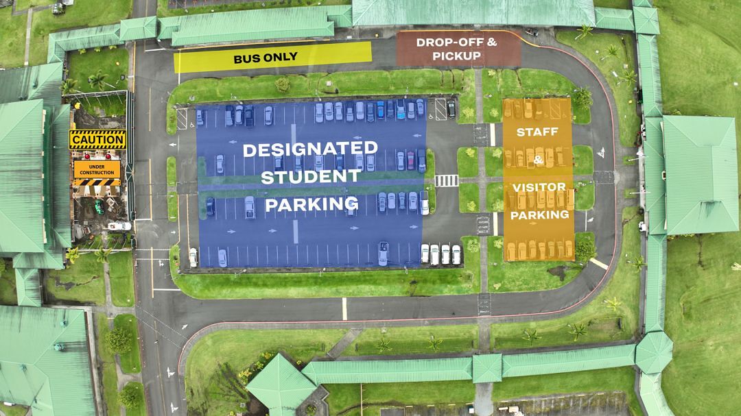 To accommodate the temporary loss of the student parking lot for the first half of the school year, adjustments are being made to relocate student parking to the visitor and staff parking lot in front of Koaiʻa Gymnasium. Students should only park in their designated spaces which are reserved until 3 p.m. on school days. Students will need to apply for one of the available stalls and will be selected according to different criteria including distance traveled, if the student is on a modified schedule, family work schedules, and more.