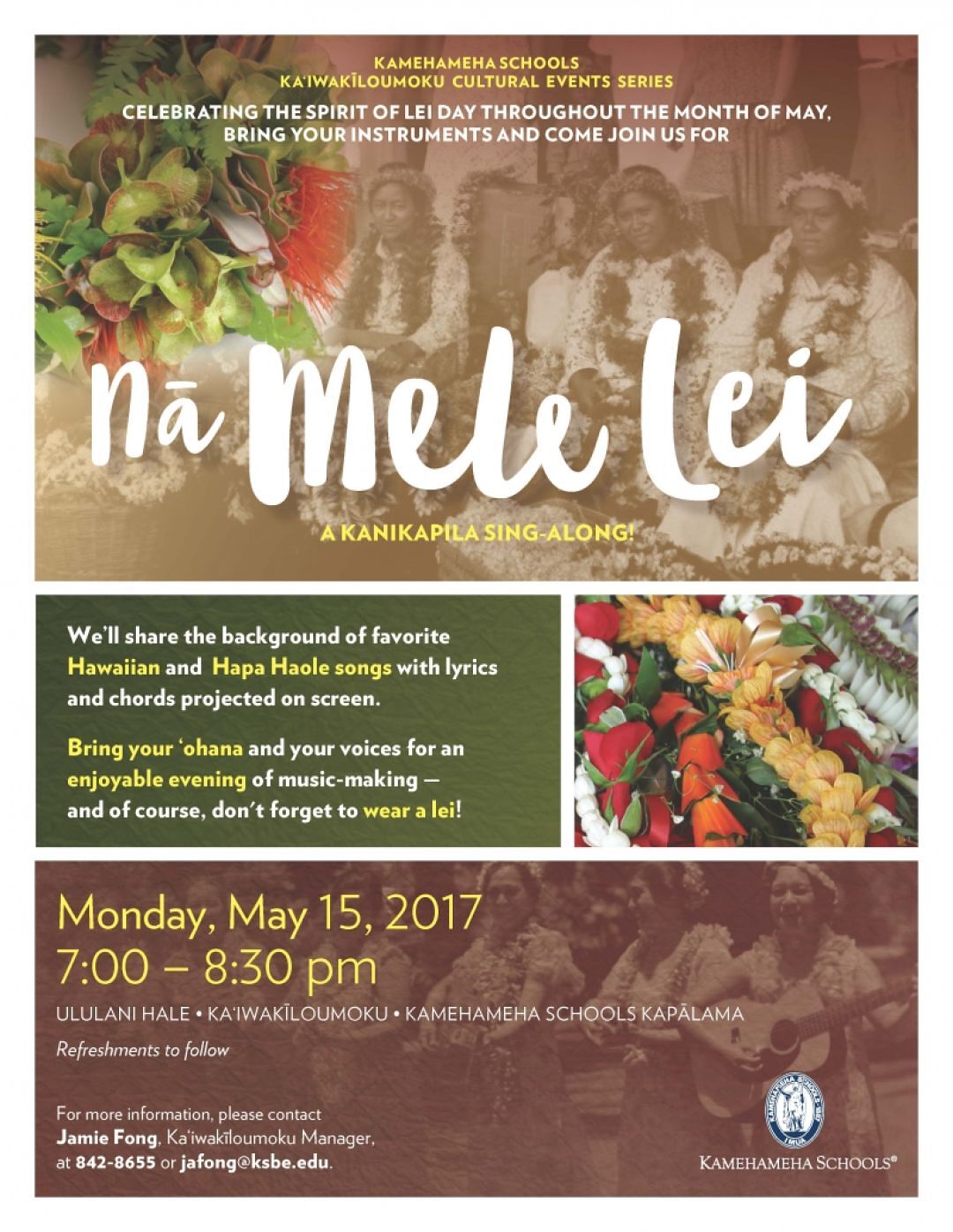 Nā Mele Lei: A Kanikapila Sing-Along will take place on Monday, May 15, 2017 from 7 p.m. to 8:30 p.m. at Ululani Hale at Kaʻiwakīloumoku.