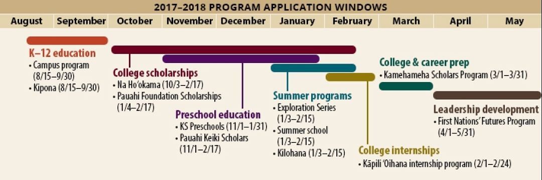Kamehameha Schools Financial Aid and Scholarship Services (FASS) programs will undergo changes this year, including timeline changes that will push up nearly all FASS program application windows. All of the education program offerings, including updated timeline and entry point information are now available at www.ksbe.edu/programs.