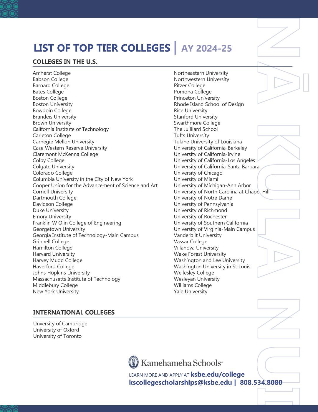 We know you are working hard to finish strong academically, while also looking ahead to the future. Our goal is for every haumāna to leave as an ʻŌiwi Edge graduate with a strong ancestral foundation that shapes your agency, adaptability, and well-being, giving you a competitive advantage to fulfill your unique purpose and kuleana. Kamehameha Schools believes that post-secondary education and training will lead to the development of ʻōiwi leaders and our vision of a thriving lāhui.