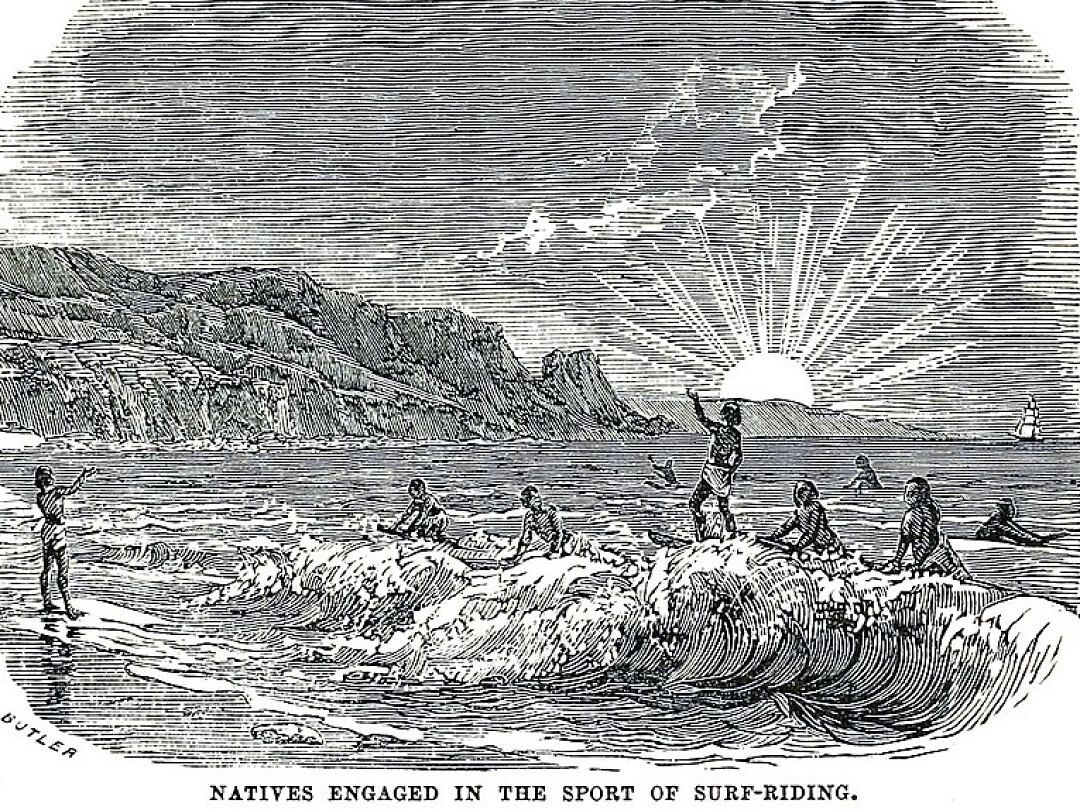 A depiction of surfing that ran in the November 1858 magazine article “Our neighbors of the Sandwich Islands,” in Hutchings California Magazine.