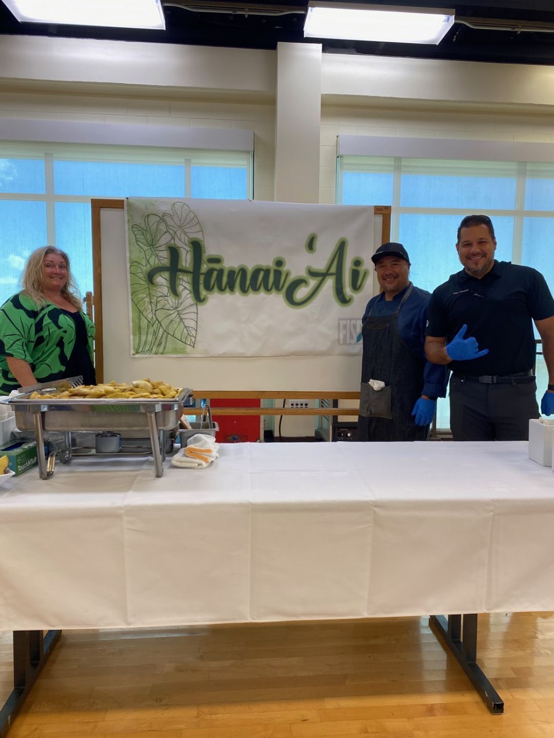 Members of Flik Independent School Dining present Chef Kealoha Domingo and ‘ulu dish that kicked off the Hānai ‘Ai program at KSK.