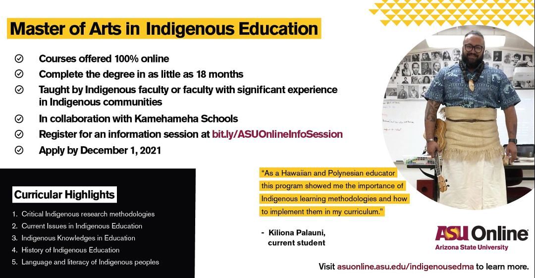 A virtual information session for students interested in ASU’s Master of Arts degree in Indigenous Education will be held on November 10, 2021. Register for the session and a Zoom invitation will be sent to you.