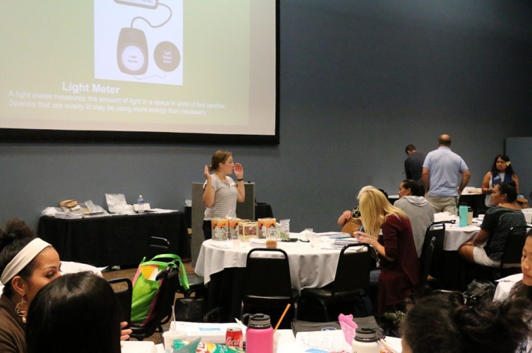 During the workshop, teachers were able to participate in various hands-on energy lessons. One activity taught educators to use Kill-a-Watt meters which measure the electrical consumption for any pluggable device. These explorations allowed kumu to practice using the various tools and instruments in their kit while getting a better understanding of energy use.