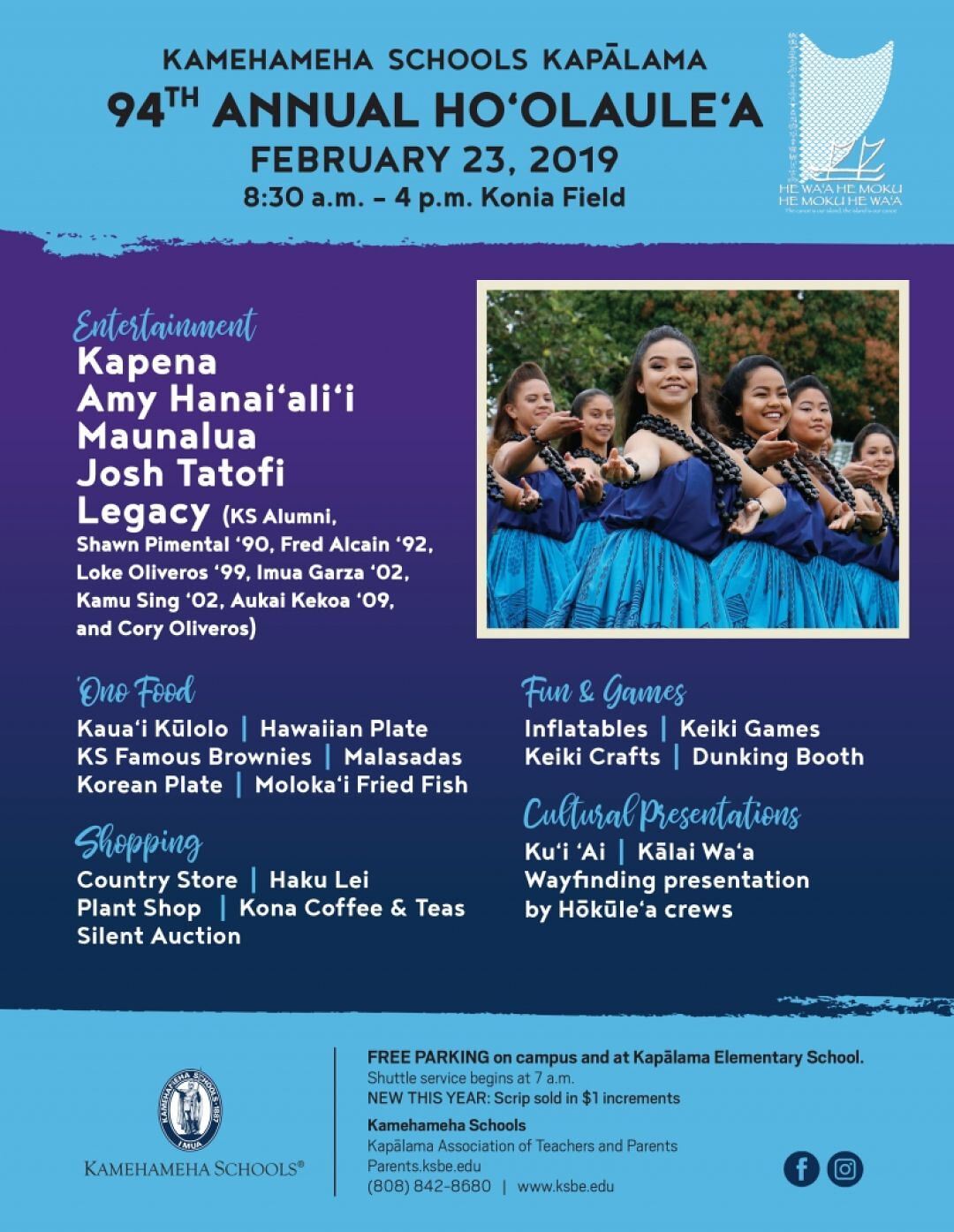 Kamehameha Schools employees, alumni, students and their ‘ohana are invited to the KS Kapālama 94th Annual Ho‘olaule‘a and KS Hawai‘i Ho‘olaule‘a on Saturday at the respective campuses.