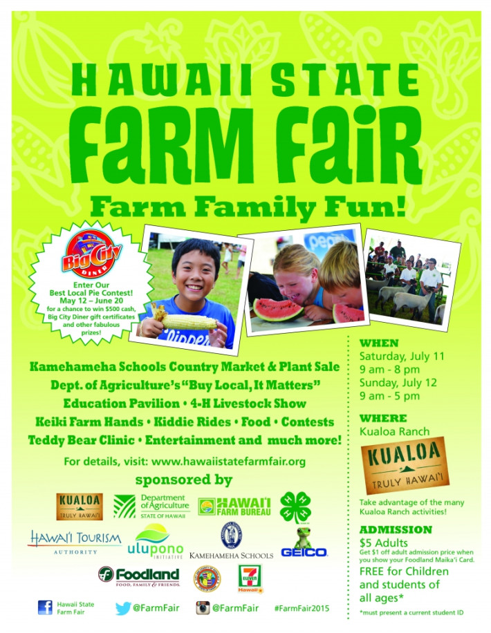 The fair will also feature ‘ono food, entertainment, keiki activities, food-eating contests, and a “Buy Local” education pavilion.