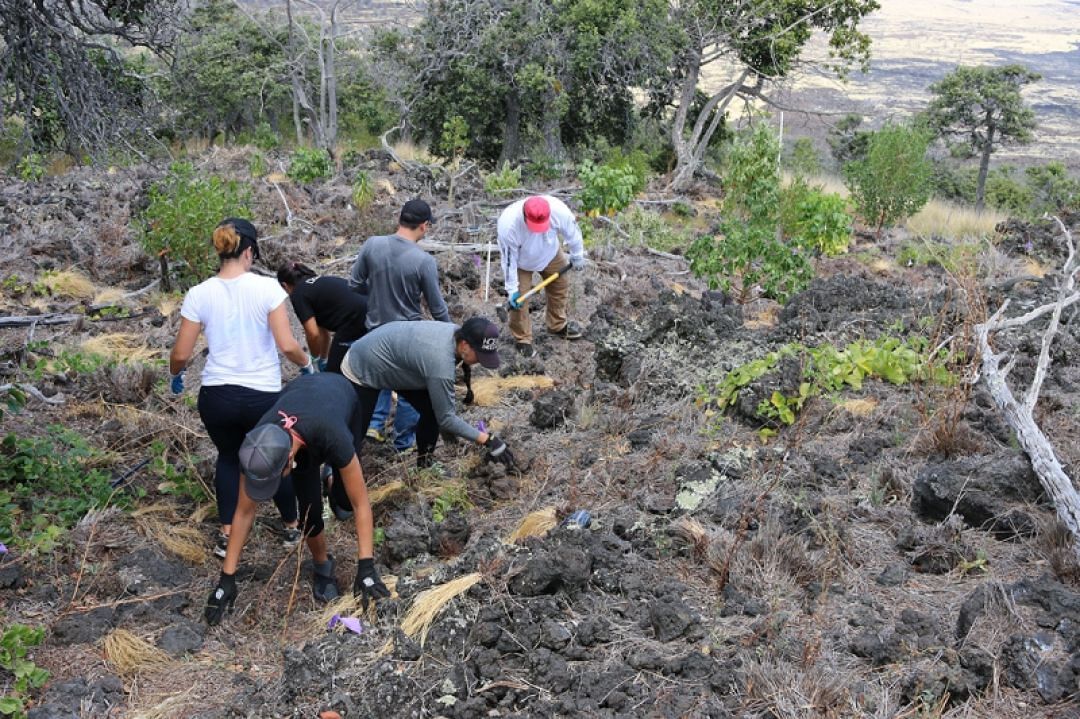Fellows practice aloha ‘āina by clearing an area to make a trail at Kaʻūpūlehu in North Kona.
