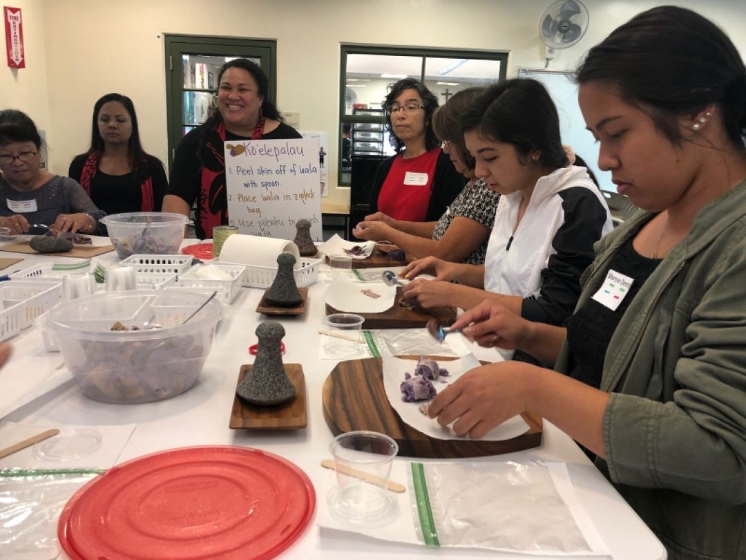 Instructors with The Institute for Native Pacific Education and Culture (INPEACE) show East Hawai ‘i preschool teachers on how to incorporate natural and free resources – like pōhaku – into lesson plans. Here, kumu prepare ‘uala to ku‘i or pound as part of the process to make sweet potato pudding or kō‘elepālau.