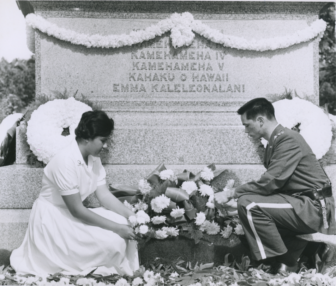 Kamehameha Schools haumāna Hattie Yonting and William Blaisdell place ho‘okupu on Pauahi’s grave site in 1962.