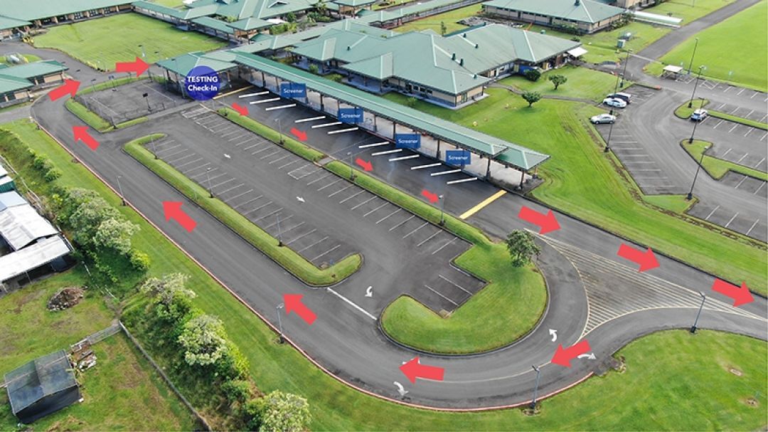 Security staff will be on-hand to assist with the new traffic pattern. After making your way to the check-in, you will park diagonally in front of a screener, facing Keaʻaumoku Nui. You will remain in your vehicle at all times. Once you're done filling the saliva tube, your screener will collect it and you're set.
