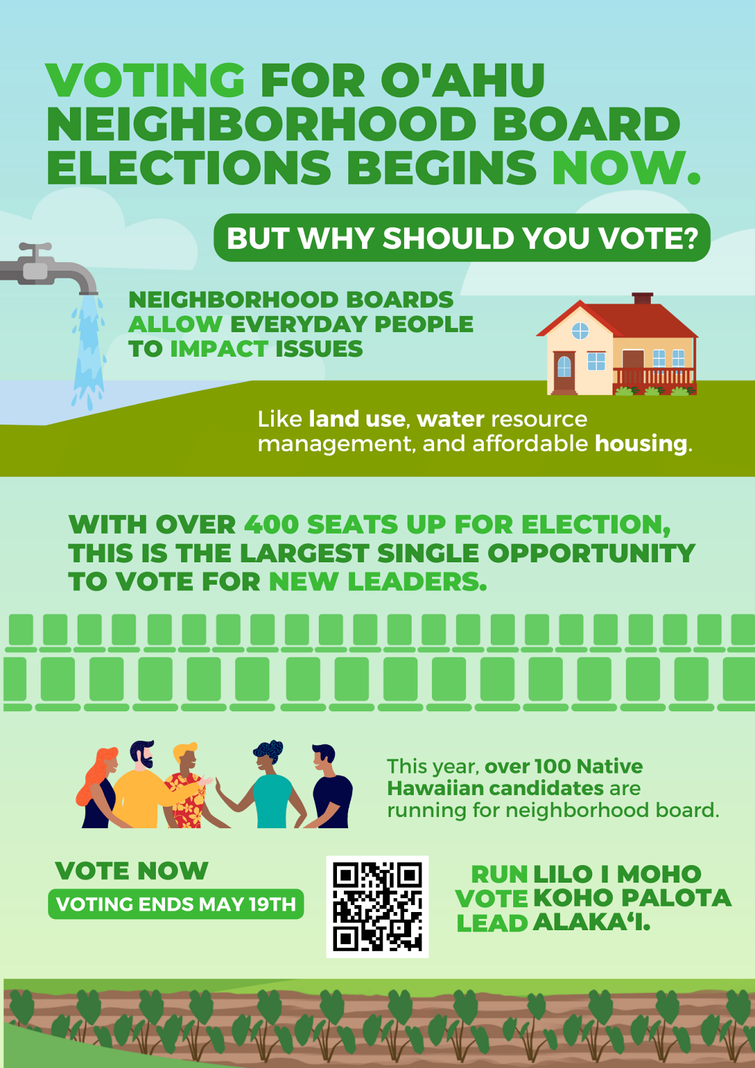 Civic engagement starts in our own community, in our own neighborhood. More and more Native Hawaiians are stepping up to lead. This year, over 100 Native Hawaiian candidates are running for a seat on their neighborhood boards.