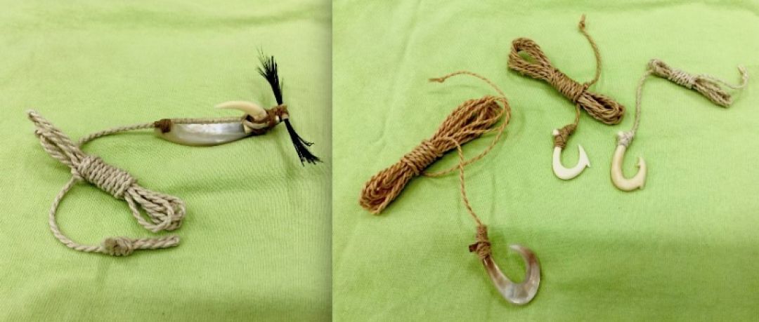 Various mākau made from 2015-2016 class, under the direction of Kai, using bone and shell with natural fiber cordage (hau).