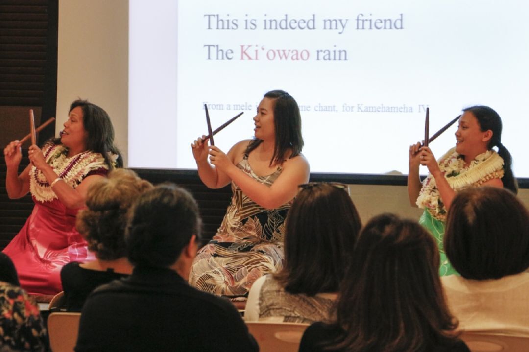 Kumu Hula Leimomi Akana, Casey Lum Peterson and Kiele Gonzalez perform “Ua Nani ‘o Nu‘uanu,” dedicated to Kamehameha IV, at a recent book signing.