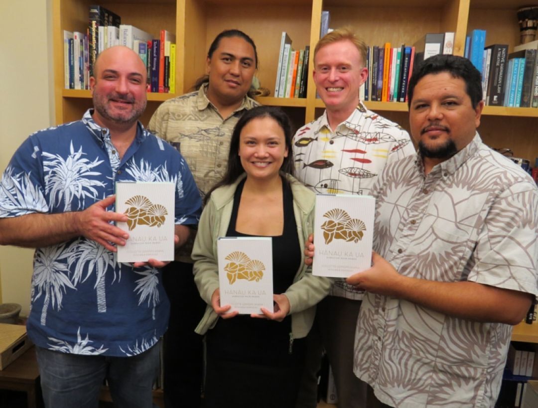 The KS publishing team: Kamehameha Publishing Director Ron Cox, Editor Kamaoli Kuwada, Hawaiian-Language Publishing Specialist Kiele Gonzalez, former Managing Editor Matthew Corry, and former Editor Keoni Kelekolio.