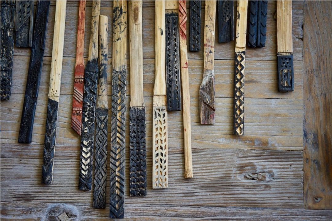 Hale Kua is the Hawaiian term for a “beating house” in which kapa was produced and adorned by skilled artists using ‘ohe kāpala (bamboo stamps). The intricate hand-carved designs and patterns portrayed tales of Hawai‘i’s traditions and have become essential components throughout Manaola’s designs today.