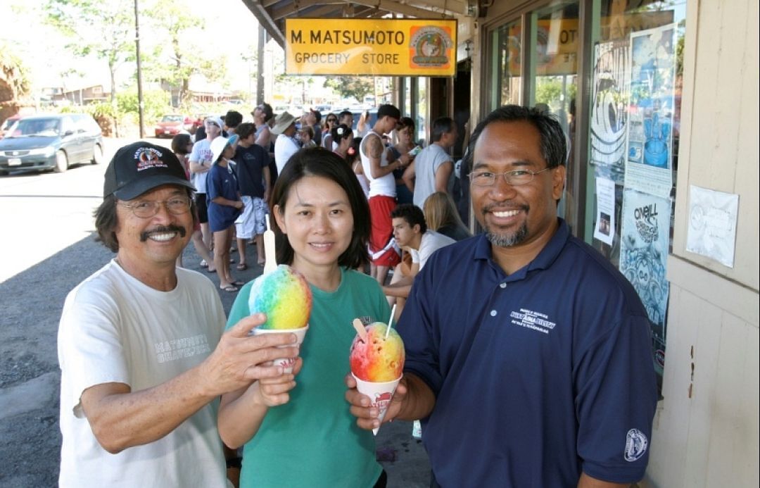 KS Senior Land Asset Manager Kalani Fronda cools off with Stan and Noriko Matsumoto, owners of Matsumoto Shave Ice, one of the center's anchor tenants.