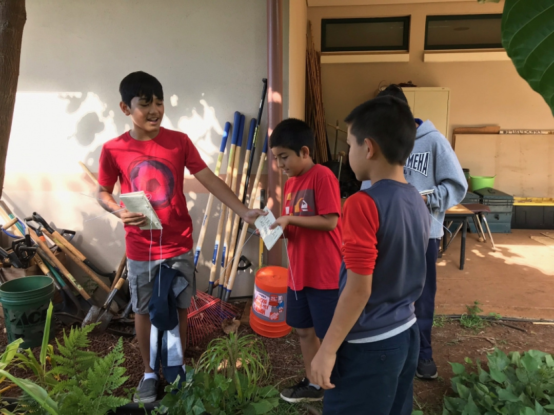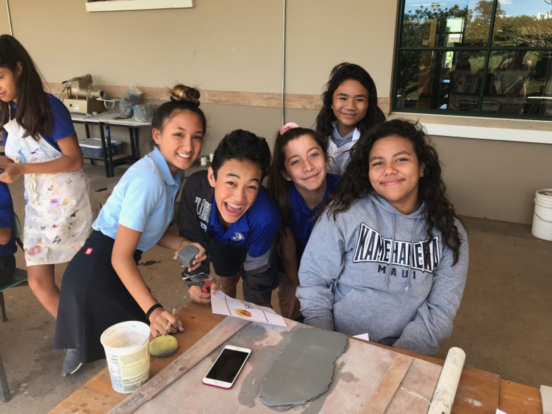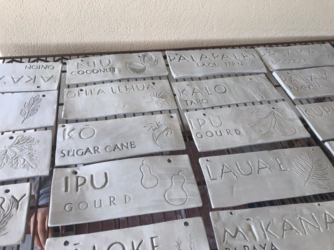 In the spirit of service, Mrs. Barsamianʻs 7th Grade Mixed Media art class collaborated with Kumu Emma Obergʻs elementary science class to create ʻōlelo Hawaiʻi plant markers for their classroom garden. The 7th graders visited the garden prior to making their markers, and got an inventory of nearly 45 different plants! They then collaborated on a design that would feature the ʻOlelo Hawaii inoa for the plants, include a picture of the plant, and the english name to help the elementary students learn the various names of and identify the plants. Once the ceramic markers were complete, the 7th grade papa visited Kumu Emmaʻs 3rd grade papa and together they installed the markers around the garden. It was a great opportunity to collaborate, provide an act of service through they artwork, and learn about native and non-native garden plants that grow on our campus.