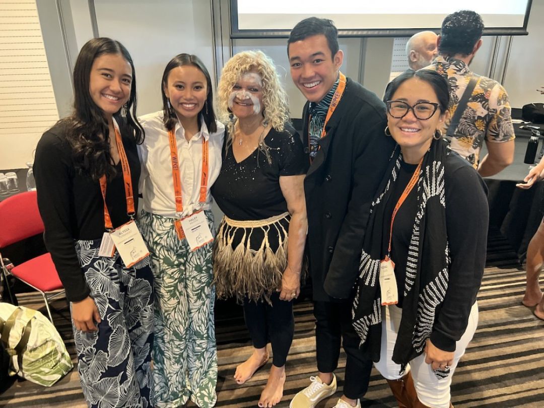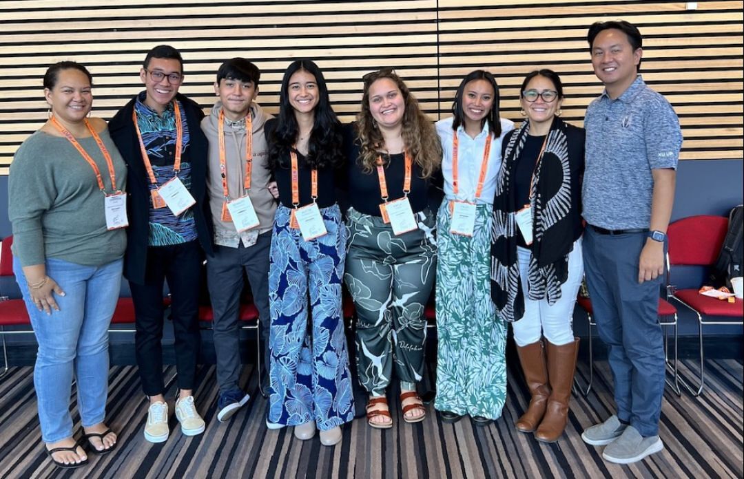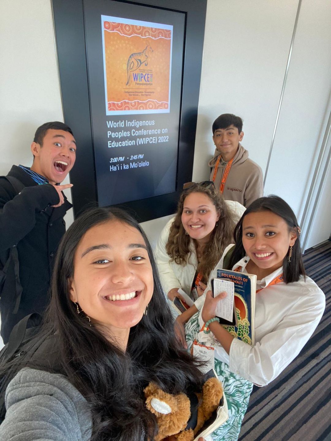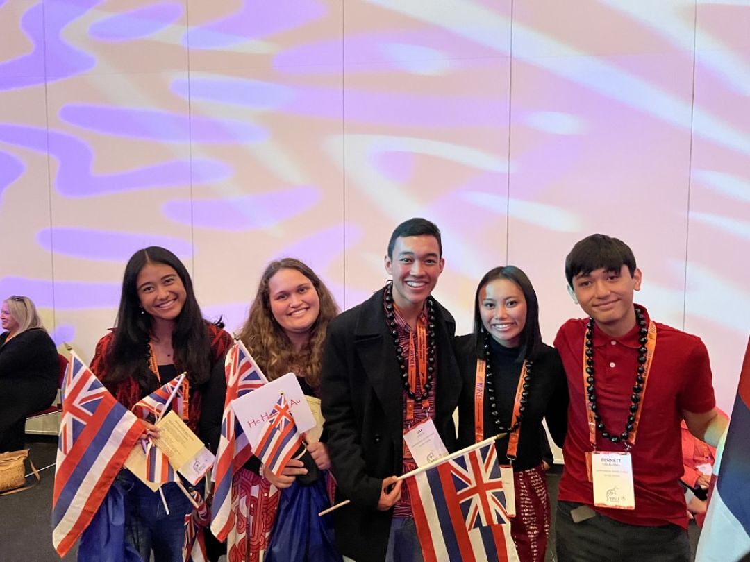 Five KS Maui haumāna traveled to the World Indigenous Peoples Conference on Education to present their labor of love: recording and sharing moʻolelo from Mary Kawena Pukui’s classic He Mau Kaʻao Hawaiʻi: Folktales of Hawaiʻi. Back row (L to R): Alyssa Fernandez KSM’24, Jai Viela KSM ’24, Haley Agustin KSM’23. Front row (L to R): Bennett Takahama KSM’24, Kayla Frias KSM’23.