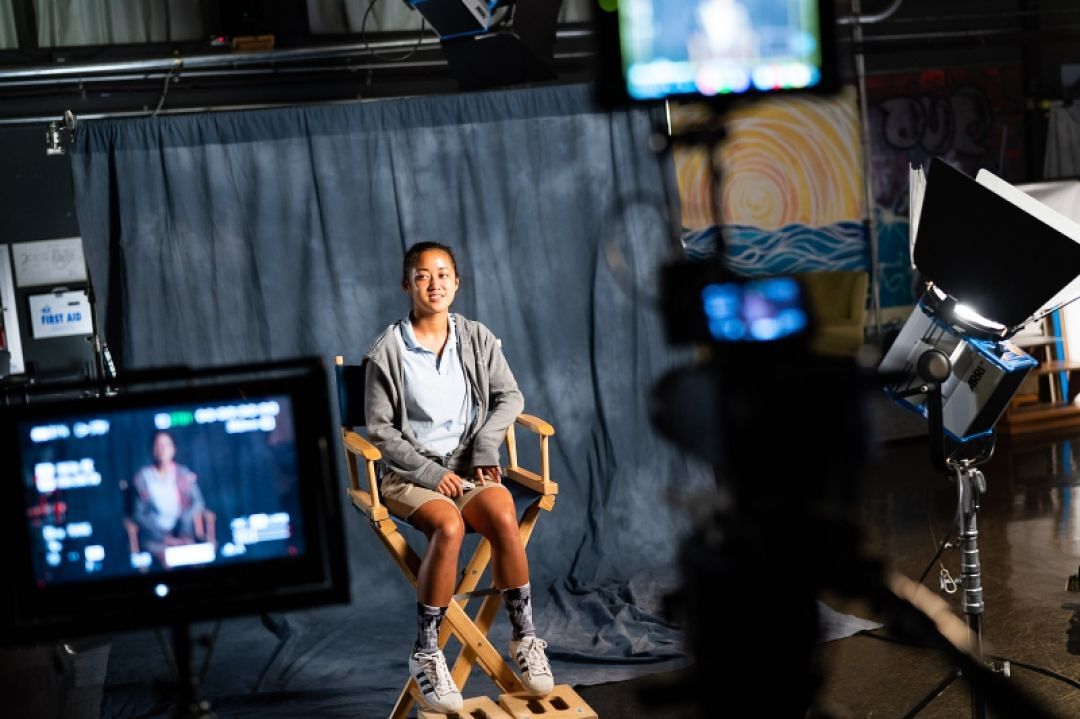 Kapālama student, Megan Lee-Watanabe (c/o 2019), sits in while the production crew makes adjustments to the lighting.