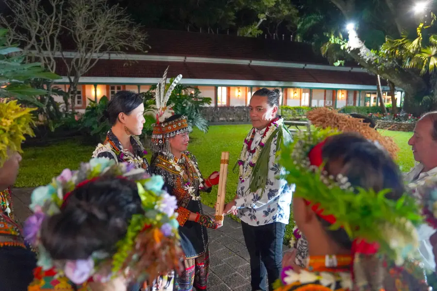 Much has happened over the last 5 years: In July 2021, the Paiwan dedicated a ceramic pot to Kamehameha Schools. They broke off a piece from the lip of the pottery and sent it to Hawaiʻi, so that it could be presented and reconnected with the original vessel as a way to identify ourselves as family when we come to visit in person in the future. In June of 2023, Princess Maljevljev and tribal members were invited to offer an ancestral blessing for the Hōkūleʻa at the global launch of the Moananuiākea Voyage in Juneau, Alaska. A year later in June 2024, the Kaviyangan Paiwan were hosted by Kamehameha Schools as guests to the 13th Festival of Pacific Arts and Culture. Some 300 Indigenous Taiwanese representing over eight different tribes were hosted at a lūʻau at Kaʻiwakīloumoku as they interacted with Hawaiian, Tahitian, Cook Islands, and Rapa Nui delegations through song and dance. A month later, in July of 2024, Kamehameha Schools was invited to be the featured performers at the prestigious Austronesian Joint Harvest Festival in Hualien for an audience of over 15,000 Indigenous Taiwanese. As part of that trip, Kamehameha students and staff were finally able to visit our Paiwan family in their home village of Kaviyangan and honor the Zingrur Royal Family who have been leading their tribe for 19 generations.