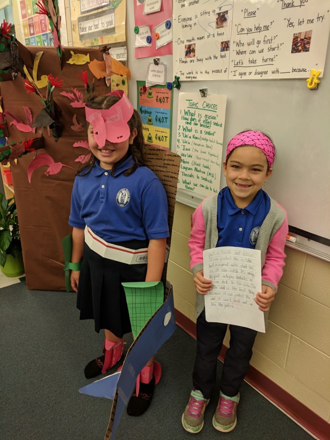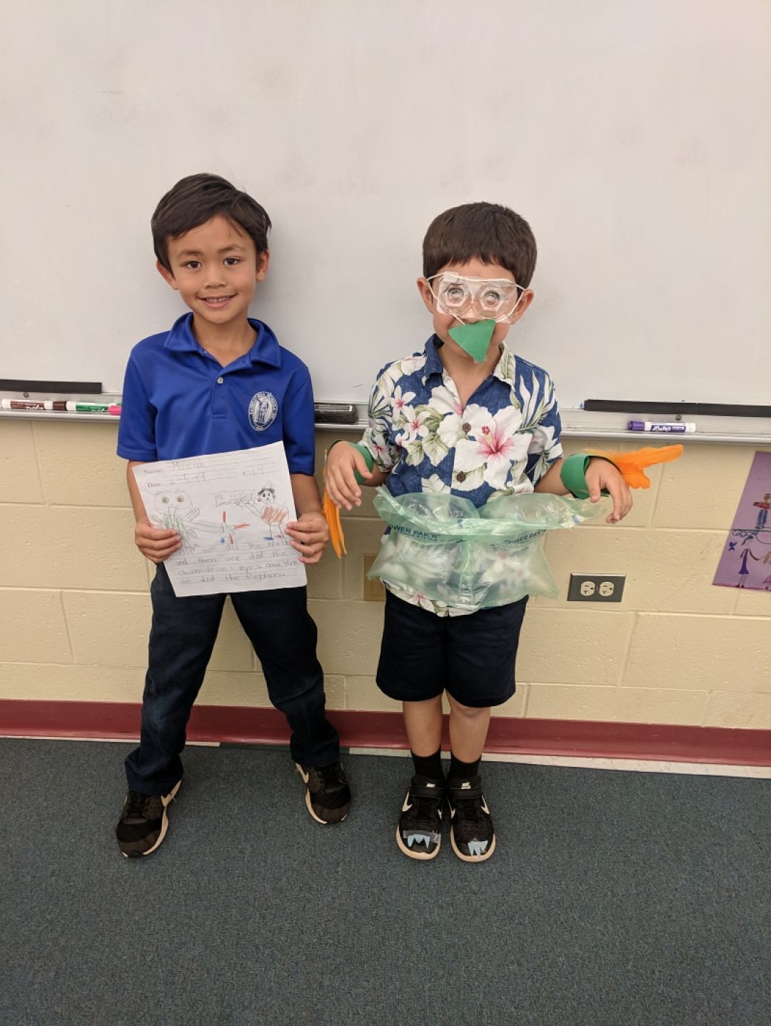 First grade has been learning about animal adaptations. They have learned animals appear to have superpowers. They worked in pairs to make an animal superhero suit, combining different animal parts to complete one of three missions: underground hideout, sky surveillance or an underwater mission. They presented their suits last week!
