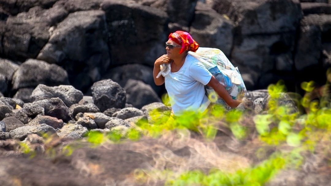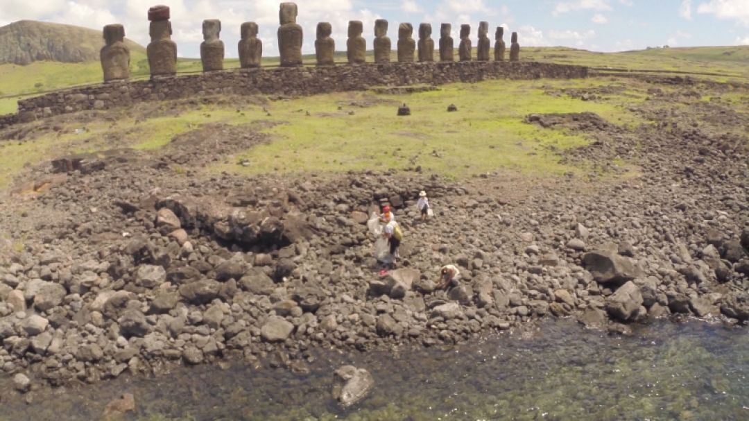 Mama Piru and volunteers collect trash and marine debris from a moai site in Rapa Nui.