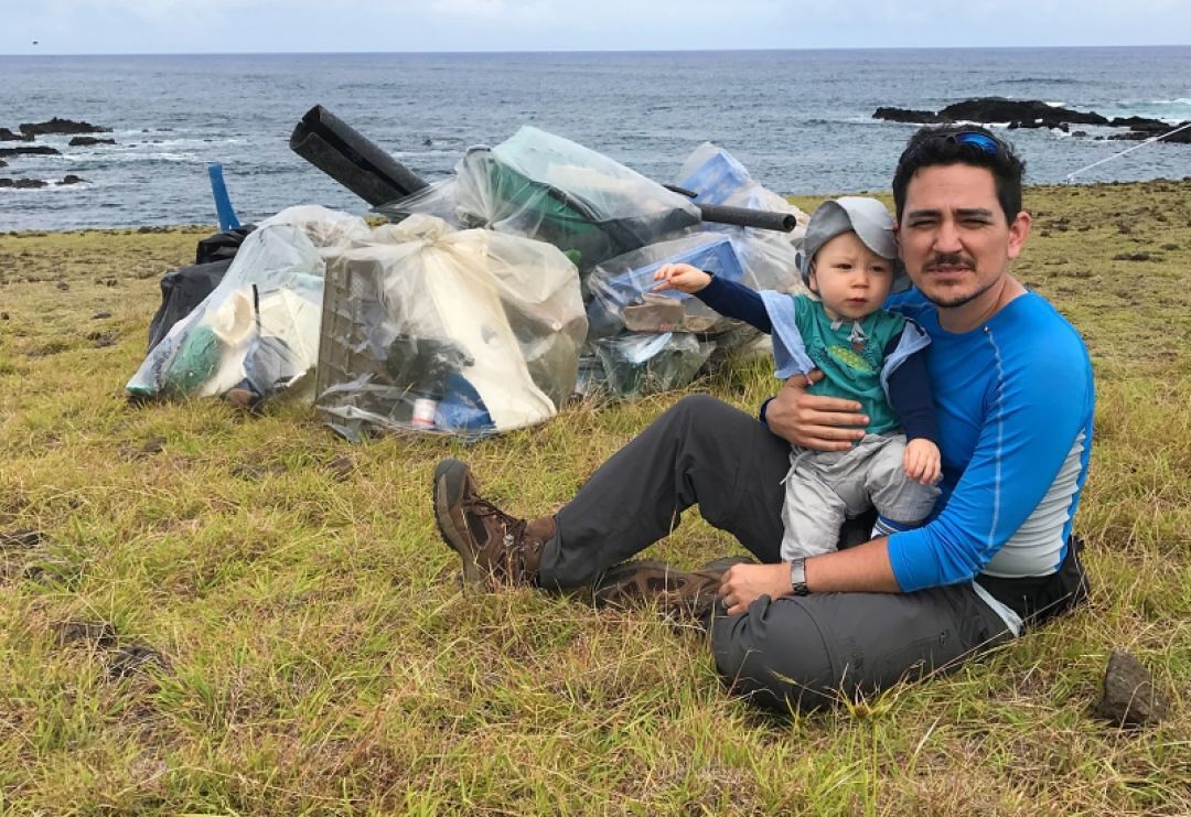 Filmmaker Sergio Mataʻu Rapu framed “Eating Up Easter” as a cinematic letter to his son. Here, he and his son after a coastal cleanup in Rapa Nui.