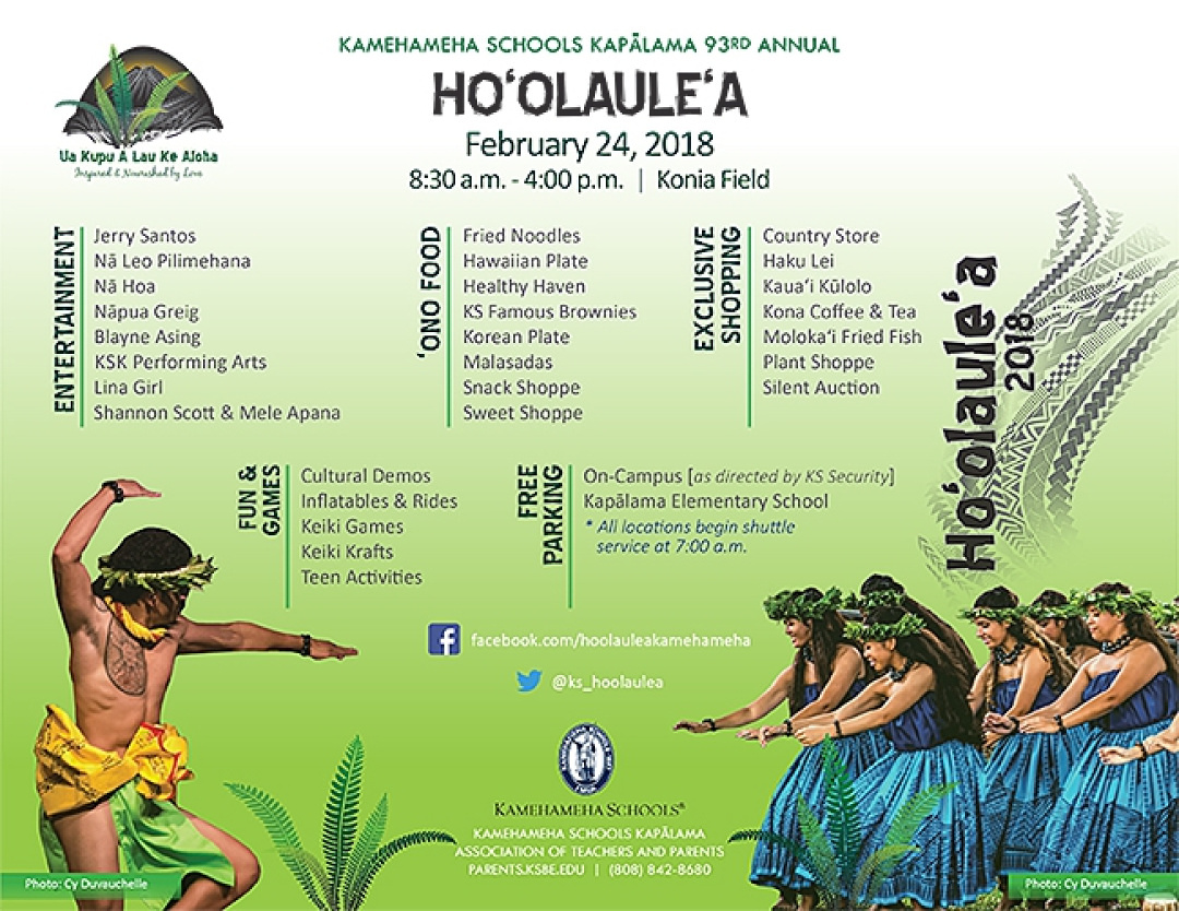 Hoʻolauleʻa festivities at both Kamehameha Schools Kapālama and Hawaiʻi campuses will take place this Saturday, Feb. 24. The free events will feature fun for the whole family, including entertainment, ʻono food and games for the keiki.