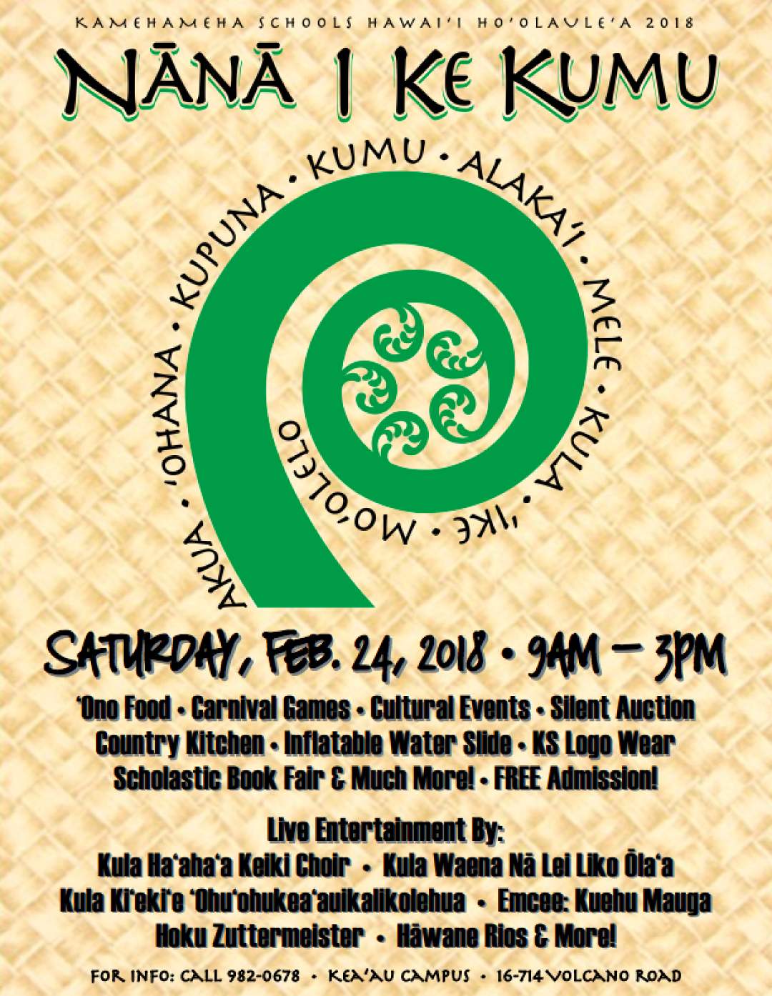 KS Hawaiʻi’s Hoʻolauleʻa is coordinated by the Parents and Teachers ʻOhana and the theme for this yearʻs event is “Nānā I Ke Kumu – Look to the Source”. The event will take place from 9:00 a.m. to 3:00 p.m. throughout kula haʻahaʻa.