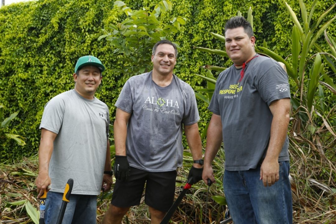 Senior Employee and Labor Relations Consult Jason Minami, Senior Director Cliff Jamile and Procurement Administrator Kenneth Kalama cut back some heleconia bushes.