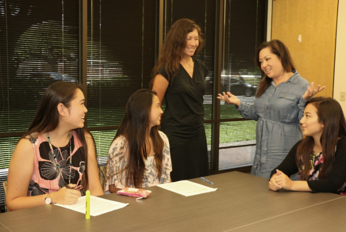 KSK juniors Carina Tanaka and Lauren Lau (left) receive valuable mana‘o from HR Compliance Program Manager Michelle Swan, HR Managing Director Winona White and KSK alumna Chayla Nakamoto.