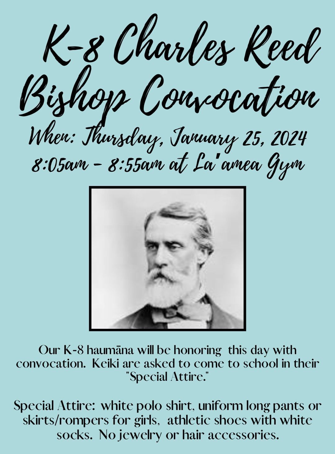 Our K-8 haumāna will be honoring Mr. Charles Reed Bishop and the important role he played in bringing Ke Aliʻi Pauahi's vision to life. Haumāna will take part in a special convocation, and are asked to wear their special event/chapel whites to school on that day. The convocation will be recorded and will be available for viewing on the KS YouTube channel later that day.