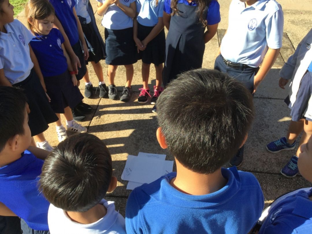 Kumu Kalehuawehe’s class looks down at the cardinal directions and determines where each location is by using the sun.