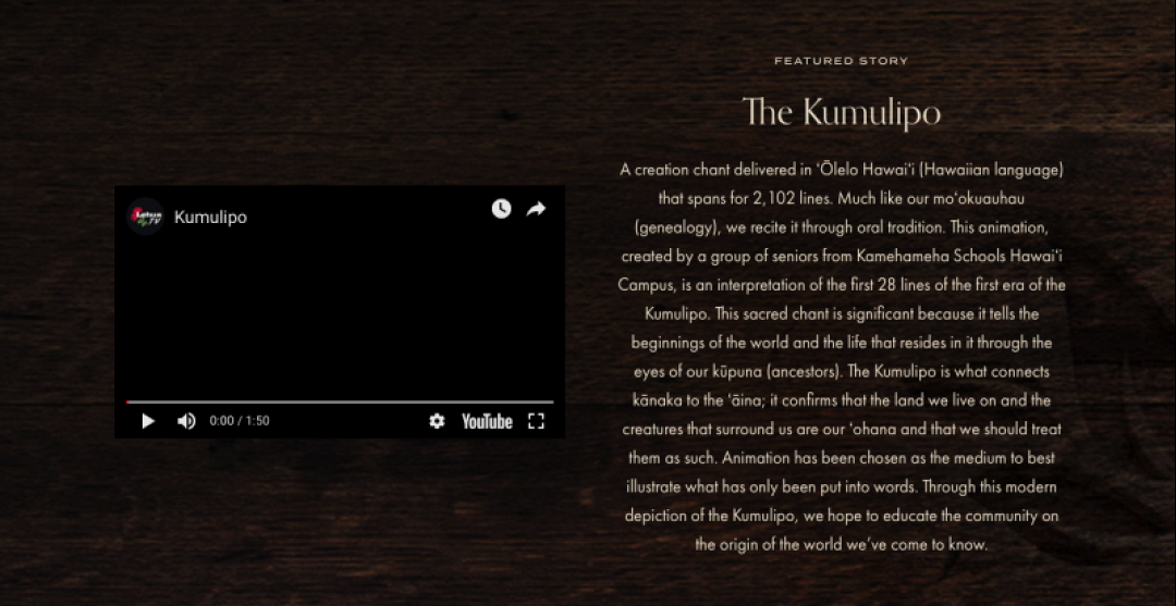 Students produced an animation of the first 28 lines of the Kumulipo in recognition of the significance of this oli and building upon the oral traditions of our ancestors. It is the featured video on the Merrie Monarch website.