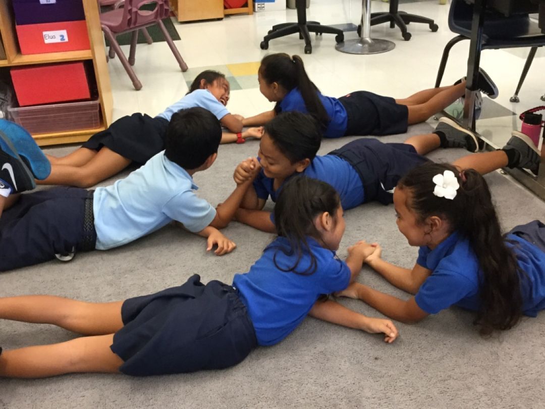 It is one thing to set goals, but it is another to set forth a plan and follow it through. Doing this will take a lot of hard work. The students also made the connection that Kamehameha was successful because he was a dedicated student. He listened to his teachers, trained hard to become strong and worked hard to learn everything he needed to know to lead his people. The students practiced some of these strength building exercises such as arm wrestiling (uma) and foot pushing. They learned that it took strength and stamina to keep the foot pushing going between themselves and their partner. In class they are working to build stamina in reading and writing by participating in both activities a little longer each day.