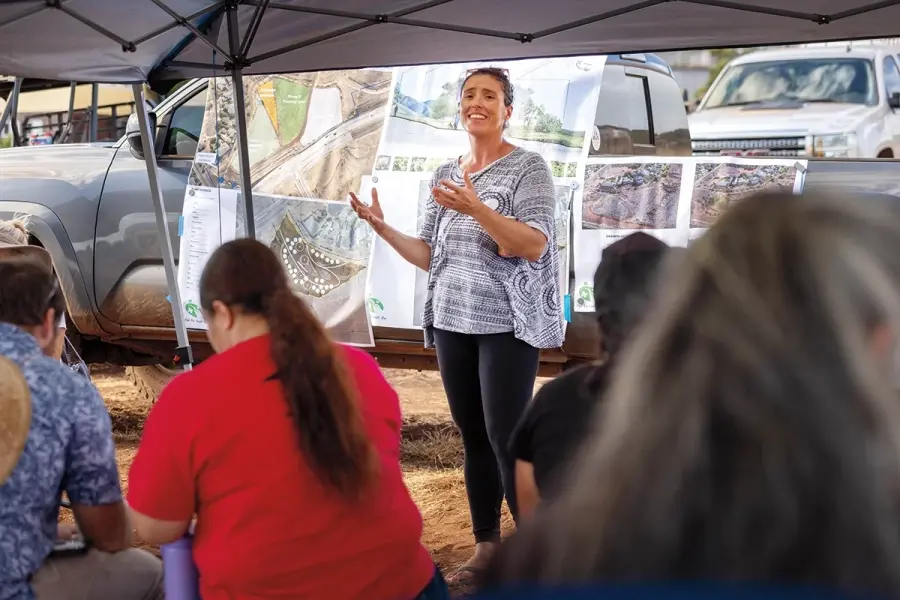 Fellow community advocate and Lahaina native Carolyn Auweloa has been handling outreach for one of the early phases of the Ku‘ia plan. Located just above the Lahaina Bypass, Kamehameha Schools is planting native trees and food crops on a one-acre parcel, with plans to add more food trees on an adjoining one-acre parcel in 2025.