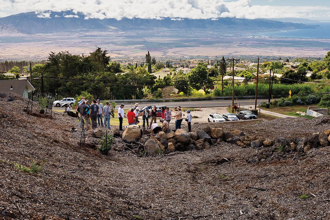 The project, spearheaded by the Kula Community Watershed Alliance, initially targets 25 acres of fire-ravaged hillside. Loui’s and a neighboring property are being prioritized because they pose the highest risk for triggering mudslides and runoff that could harm ma kai areas like Keālia Pond and even Kīhei. Loui’s nephew, Joshua Worth KSM’21, grew up on the Kula Sandalwoods property and says he’s proud of the tight-knit Upcountry community.