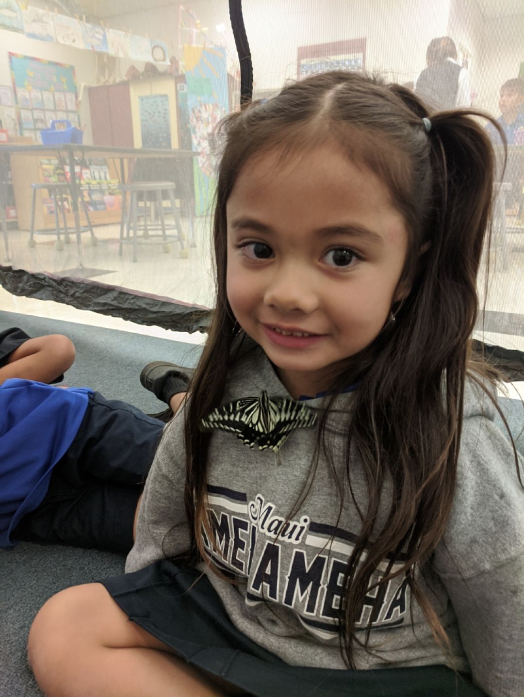 Kindergarten just completed a mini unit on insects. The Maui Butterfly Farm came to visit to show the students the complete life cycle of the butterfly. The students got to see eggs, held caterpillars, a chrysalis and even got to have butterflies on their shirt!