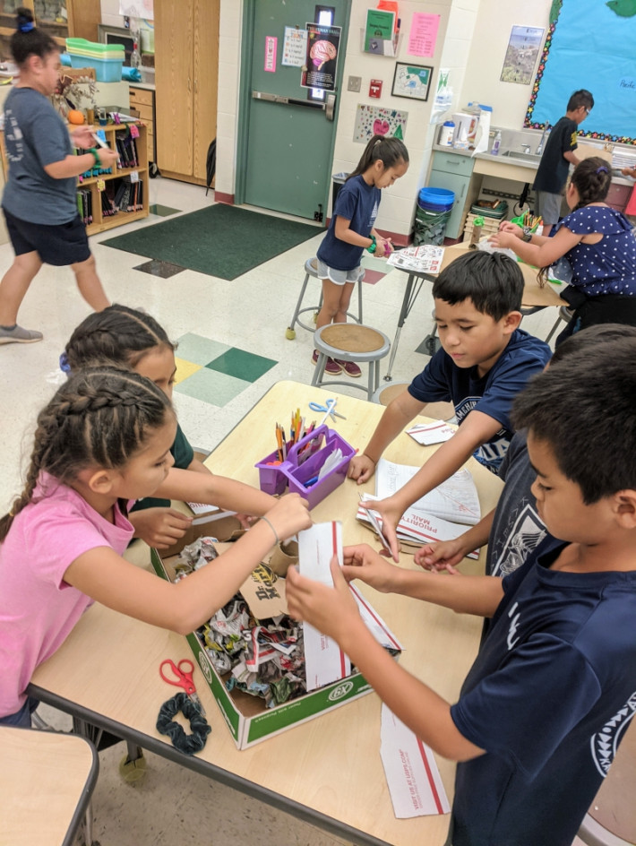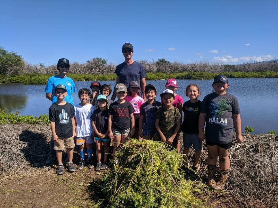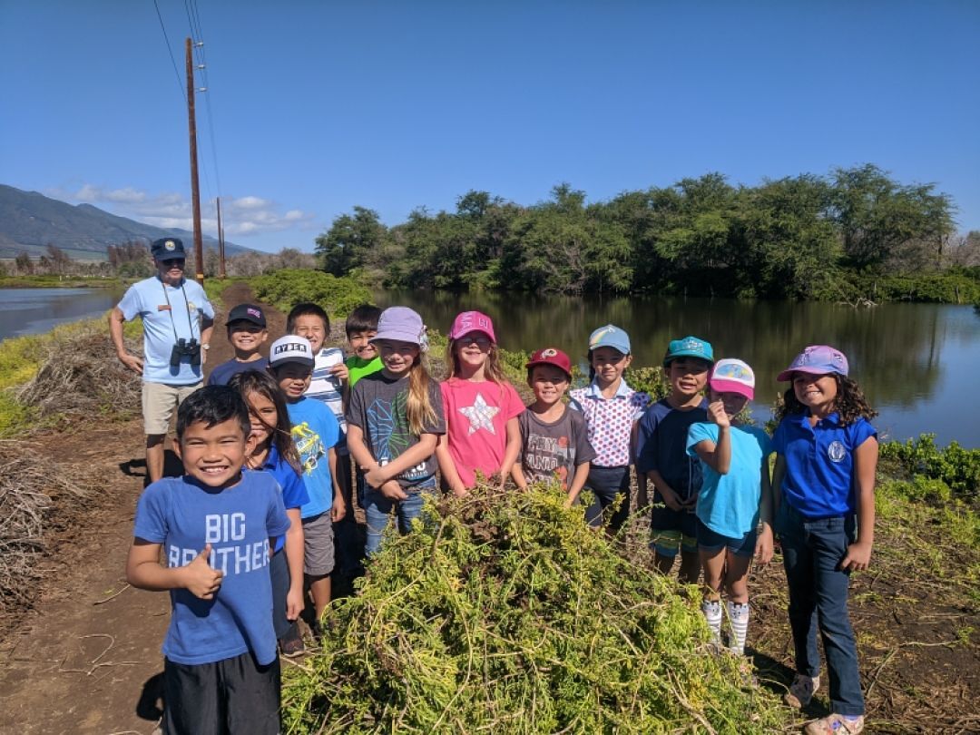 First grade just got back from a field trip at Keālia Pond. The students have been learning about the wetland as a habitat and have learned about five wetland birds. On the field trip, they got to see the Aeʻo, Alae keʻokeʻo and the ʻAukuʻu! The students also helped the birds get ready for nesting season by removing the pickleweed that grows around the ponds.