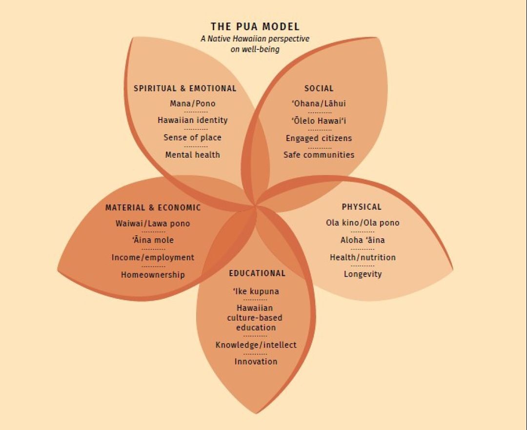 Ka Huaka‘i uses the “Pua Model” to examine Native Hawaiian strengths and well-being in multiple dimensions: social, physical, educational, material/economic, and spiritual/emotional.